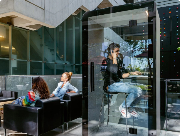 The Kteam phone booth is ideal for dynamic team discussions, strategic planning sessions, and creative brainstorming, available in 4, 6 & 8 person pods.